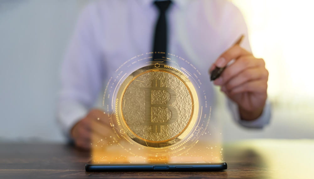Un expert financier pointant un stylet vers un hologramme doré du Bitcoin au-dessus d'une tablette, illustrant la Réglementation MiCA